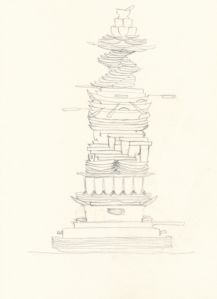 For a stack, it could be said to be epic. Largest pans and sheets on the bottom, going to smaller pans, to platters and appropriately-sized dishes with the occasional balancing item, to a rotating tower of mugs and cups that ended in a pyramid. Other words that came to mind were magnificent; unprecarious; commendable.